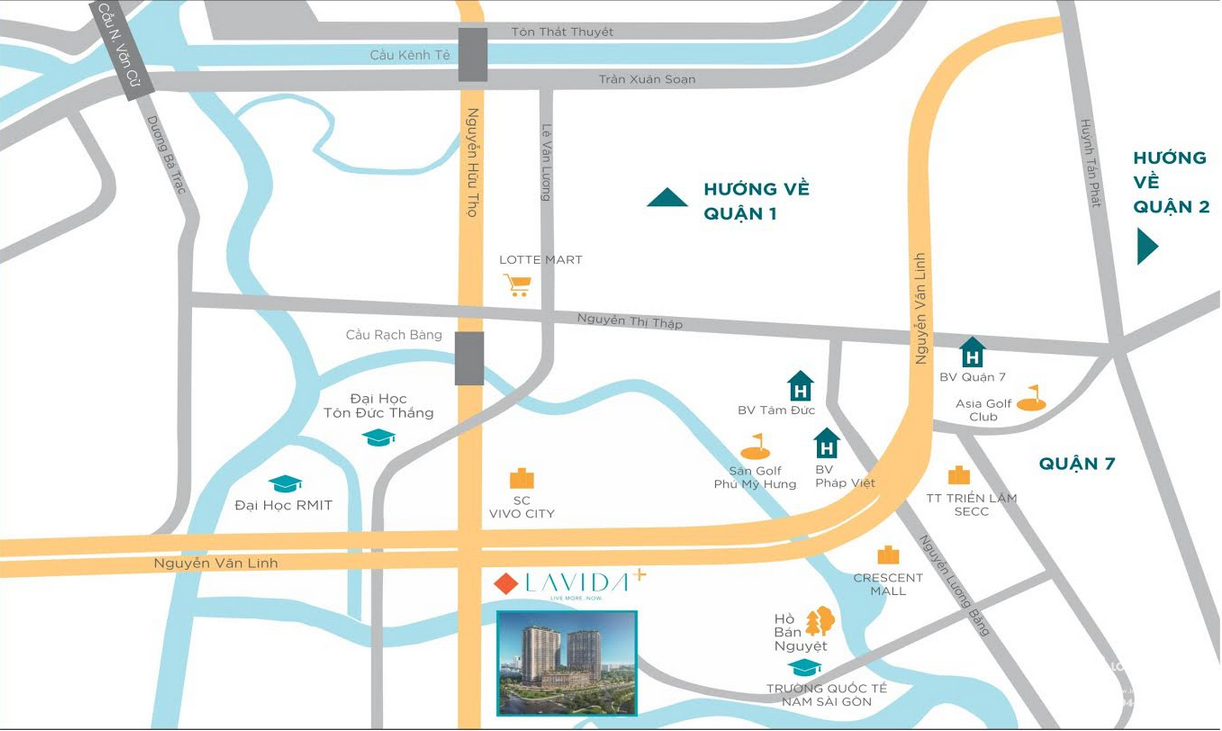 Căn hộ Lavida Plus Quận 7 nằm ngày điểm giao Đại lộ Nguyễn Văn Linh và Nguyễn Hữu Thọ đối diện TTTM SC Vivo City, cách Phú Mỹ Hưng 5 phút di chuyển.